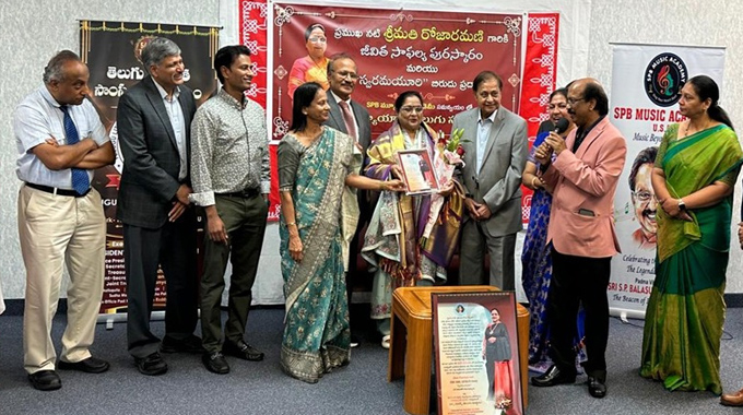 ప్రముఖ నటి శ్రీమతి రోజారమణి (Roja Ramani) గారి జన్మదిన వేడుకలు న్యూయార్క్ లాంగ్ ఐలాండ్ లో సెప్టెంబర్ 16, 2025, మంగళవారం సాయంత్రం ఎస్పిబి మ్యూజిక్ అకాడమీ ఆధ్వర్యంలో, న్యూయార్క్ లోని ప్రముఖ సంస్థలు తెలుగు సాహిత్య సాంస్కృతిక సంఘం (TLCA), ఉత్తర అమెరికా తెలుగు సంఘం (TANA), తెలంగాణ అమెరికన్ తెలుగు సంఘం (TTA), న్యూయార్క్ తెలంగాణ తెలుగు సంఘం (NYTTA) ల సహకారంతో, అత్యంత ఉత్సాహంగా ఈ వేడుకలను నిర్వహించారు. ఈ ఆత్మీయ సమ్మేళనానికి తెలుగు వారు పెద్ద సంఖ్యలో హాజరయ్యారు. ఆరేళ్ళ వయసులోనే తన మొదటి సినిమా భక్త ప్రహ్లాద తో జాతీయ చలనచిత్ర పురస్కారం గెలుచుకుని, ఆరు దశాబ్దాల పాటు మరపురాని పాత్రలను పోషించడమే కాకుండా డబ్బింగ్ కళలోని అసాధారణ ప్రతిభతో జాతీయ అవార్డులు, నంది అవార్డులను అందుకొని దక్షిణ భారత సినిమారంగానికి ఆమె చేసిన అపూర్వమైన సేవలకు గాను, శ్రీమతి రోజా రమణీకి ‘‘స్వరమయూరి’’ బిరుదు తో బాటు జీవిత సాఫల్య పురస్కారం అందజేసి న్యూయార్క్ తెలుగు కళా సంఘాలు ఘనంగా సత్కరించాయి.